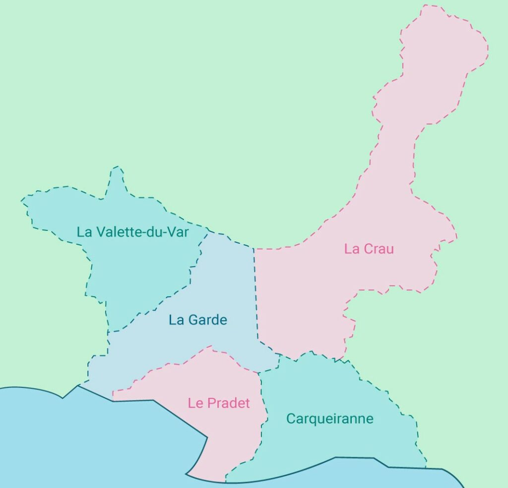 La CPTS Var Provence Méditerranée intervient dans 5 territoires à travers le Var : Carqueiranne, La Crau, La Garde, La Valette-du-Var et Le Pradet, ce qui constitue un bassin de plus de 87 500 habitants.